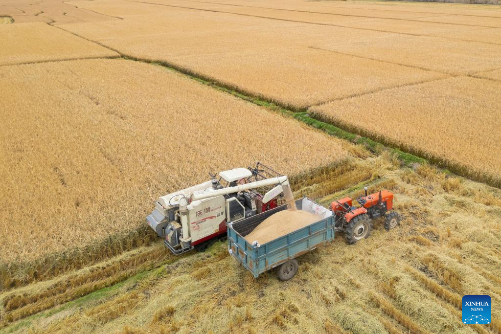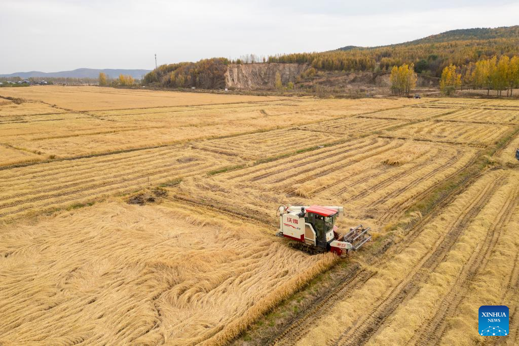 A farmer drives a reaper to harvest rice in Mudanjiang City, northeast China's Heilongjiang Province, Oct. 14, 2025. The autumn harvest in Heilongjiang, China's top grain producer, has been in full swing. As of Oct. 14, Heilongjiang had completed the harvesting of approximately 153.60 million mu (10.24 million hectares) of autumn grain crops, accounting for over 60 percent of the total. (Xinhua/Zhang Tao)