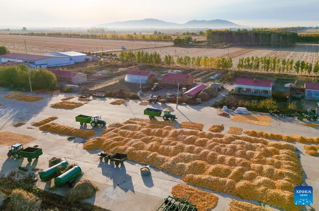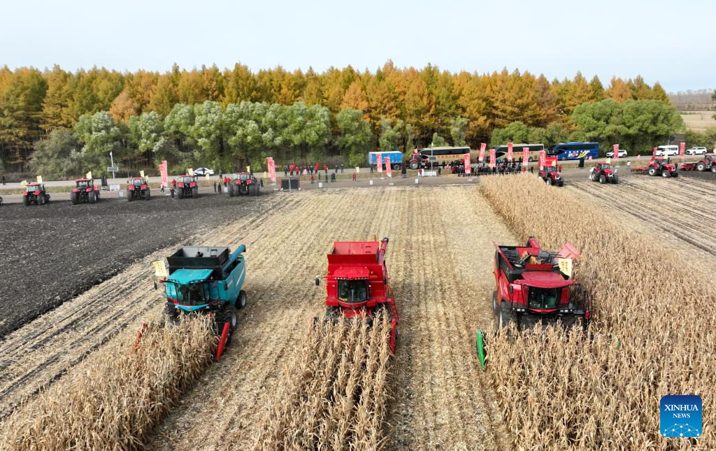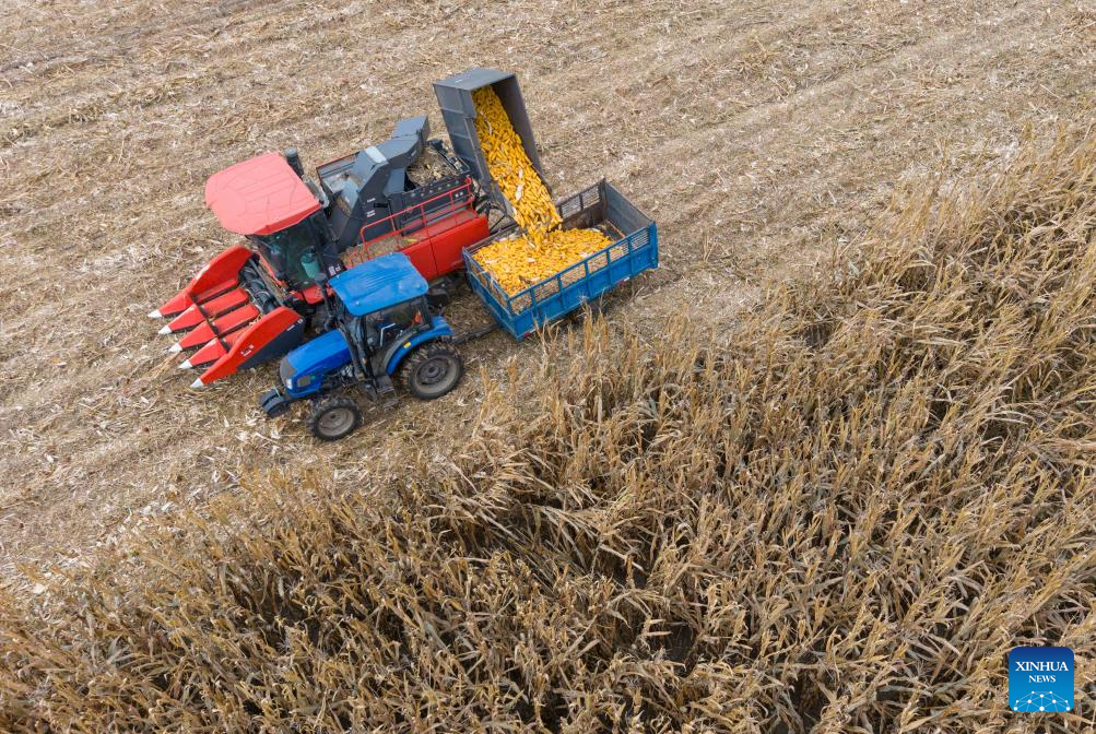 An aerial drone photo taken on Oct. 14, 2025 shows farmers harvesting corns in Suihua City, northeast China's Heilongjiang Province. The autumn harvest in Heilongjiang, China's top grain producer, has been in full swing. As of Oct. 14, Heilongjiang had completed the harvesting of approximately 153.60 million mu (10.24 million hectares) of autumn grain crops, accounting for over 60 percent of the total. (Xinhua/Xie Jianfei)