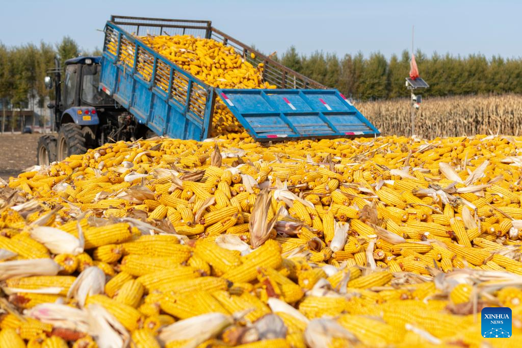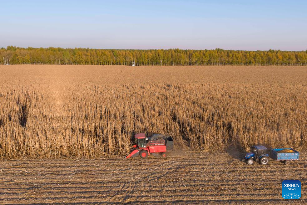 An aerial drone photo taken on Oct. 13, 2025 shows farmers harvesting corns in Suihua City, northeast China's Heilongjiang Province. The autumn harvest in Heilongjiang, China's top grain producer, has been in full swing. As of Oct. 14, Heilongjiang had completed the harvesting of approximately 153.60 million mu (10.24 million hectares) of autumn grain crops, accounting for over 60 percent of the total. (Xinhua/Xie Jianfei)