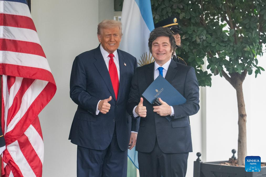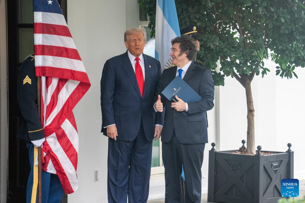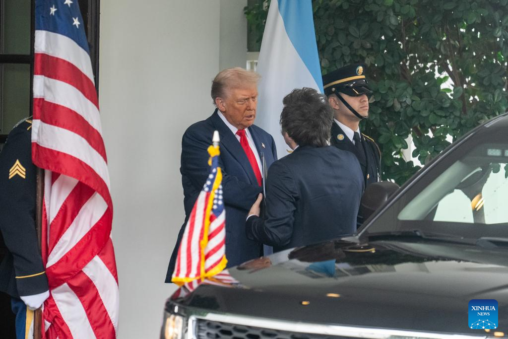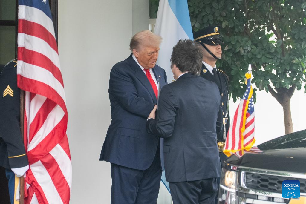 U.S. President Donald Trump (L) welcomes Argentine President Javier Milei (2nd R) at the White House in Washington, D.C, the United States, Oct. 14, 2025. (Xinhua/Hu Yousong)