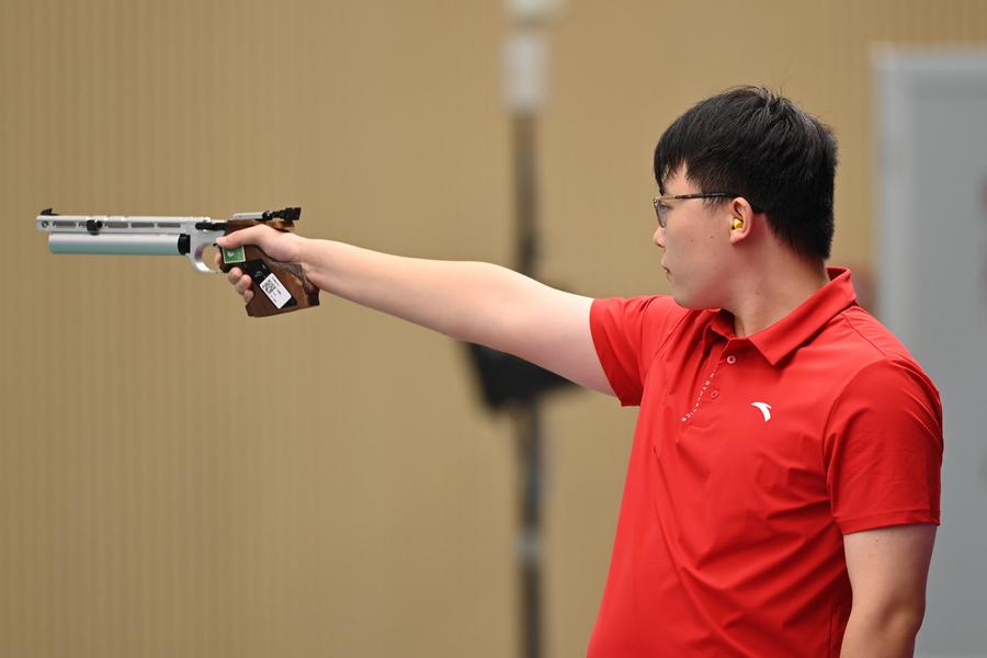 GUANGZHOU, Oct. 15 (Xinhua) -- University student Niu Qisong of Hebei produced a stunning upset on Wednesday, winning the men's 10-meter air pistol final at China's 15th National Games ahead of Olympic champion Xie Yu and World Cup ace Hu Kai.