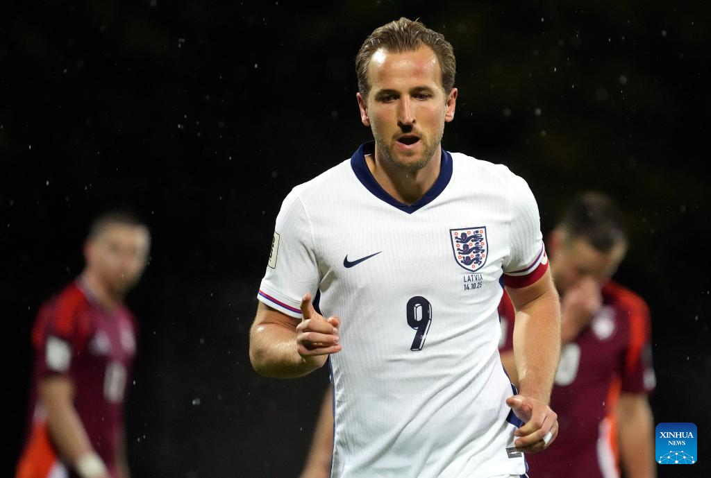 Harry Kane of England reacts during the 2026 FIFA World Cup European Qualifiers football match between Latvia and England in Riga, Latvia, Oct. 14, 2025. (Photo by Edijs Palens/Xinhua)
