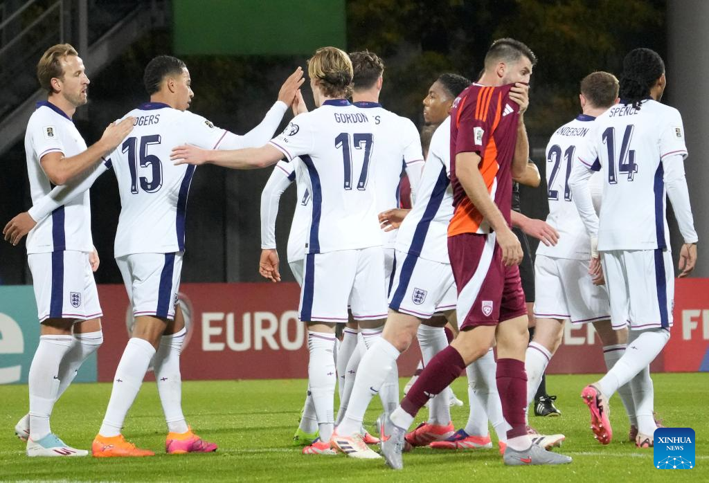 Players of England celebrate during the 2026 FIFA World Cup European Qualifiers football match between Latvia and England in Riga, Latvia, Oct. 14, 2025. (Photo by Edijs Palens/Xinhua)