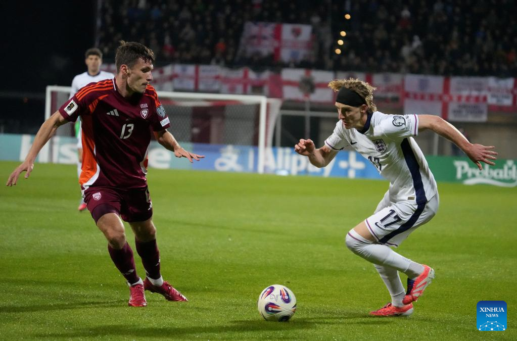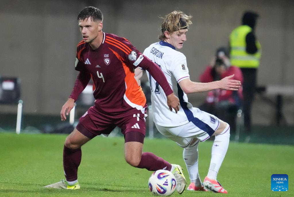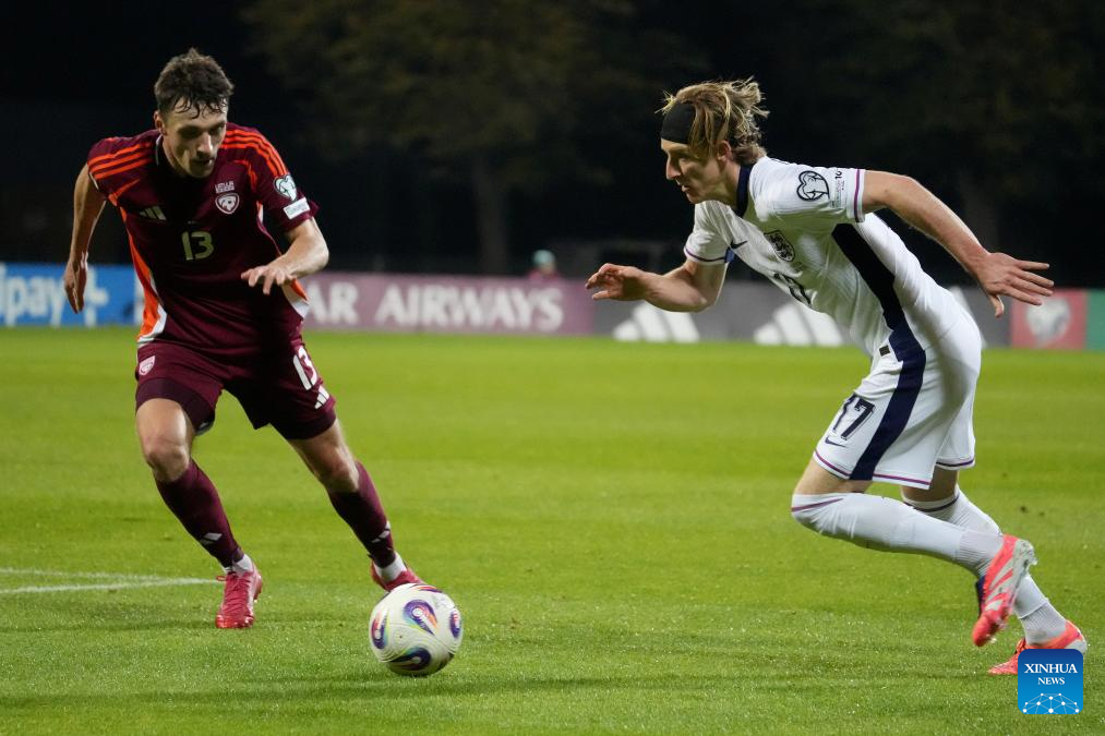 Roberts Veips (L) of Latvia vies with Anthony Gordon of England during the 2026 FIFA World Cup European Qualifiers football match between Latvia and England in Riga, Latvia, Oct. 14, 2025. (Photo by Edijs Palens/Xinhua)