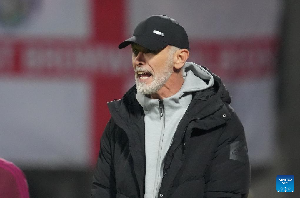 Head coach of Latvia Paolo Nicolato reacts during the 2026 FIFA World Cup European Qualifiers football match between Latvia and England in Riga, Latvia, Oct. 14, 2025. (Photo by Edijs Palens/Xinhua)