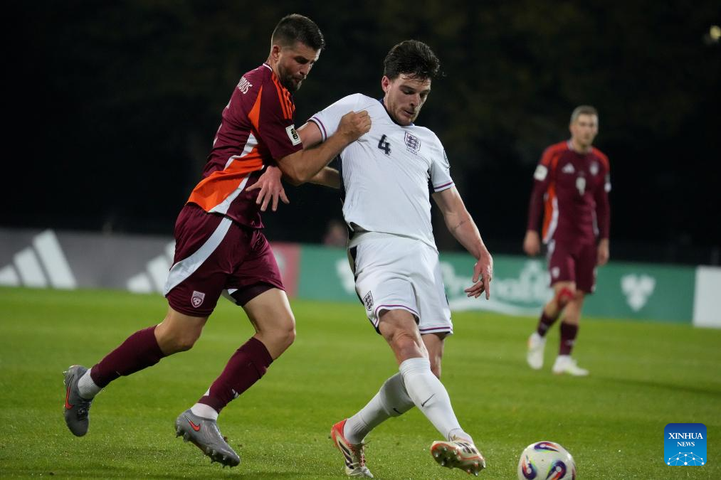 Antonijs Cernomordijs (L) of Latvia vies with Declan Rice of England during the 2026 FIFA World Cup European Qualifiers football match between Latvia and England in Riga, Latvia, Oct. 14, 2025. (Photo by Edijs Palens/Xinhua)