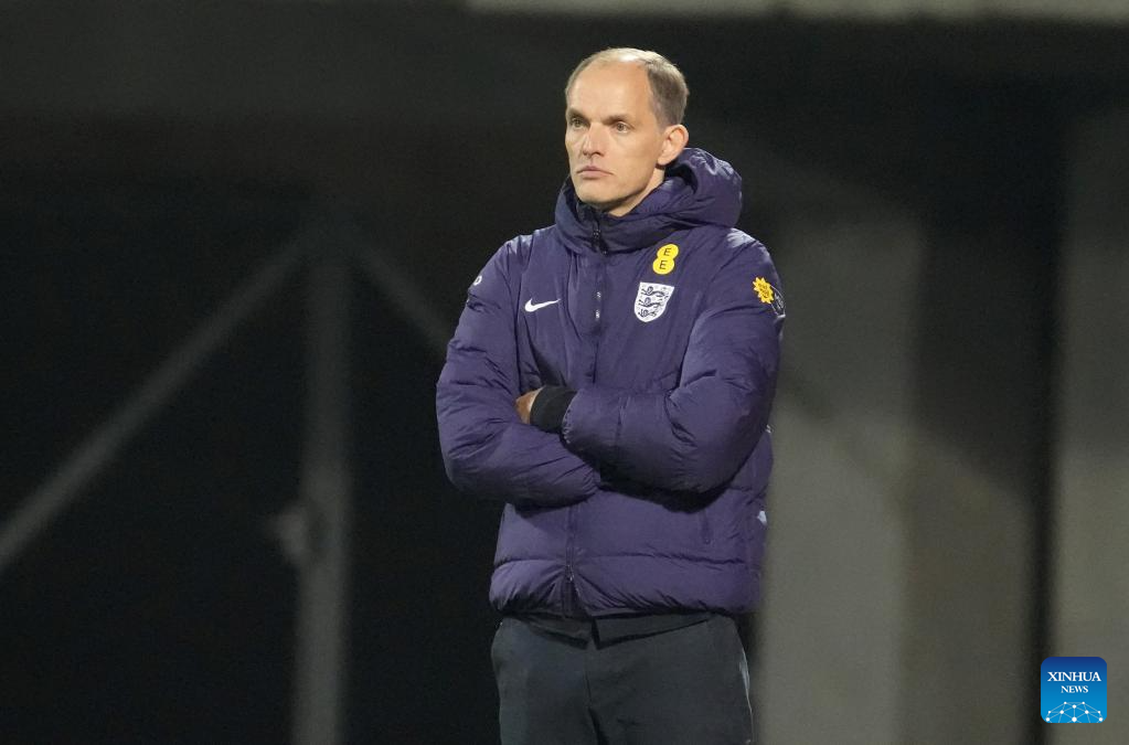 Head coach of England Thomas Tuchel reacts during the 2026 FIFA World Cup European Qualifiers football match between Latvia and England in Riga, Latvia, Oct. 14, 2025. (Photo by Edijs Palens/Xinhua)