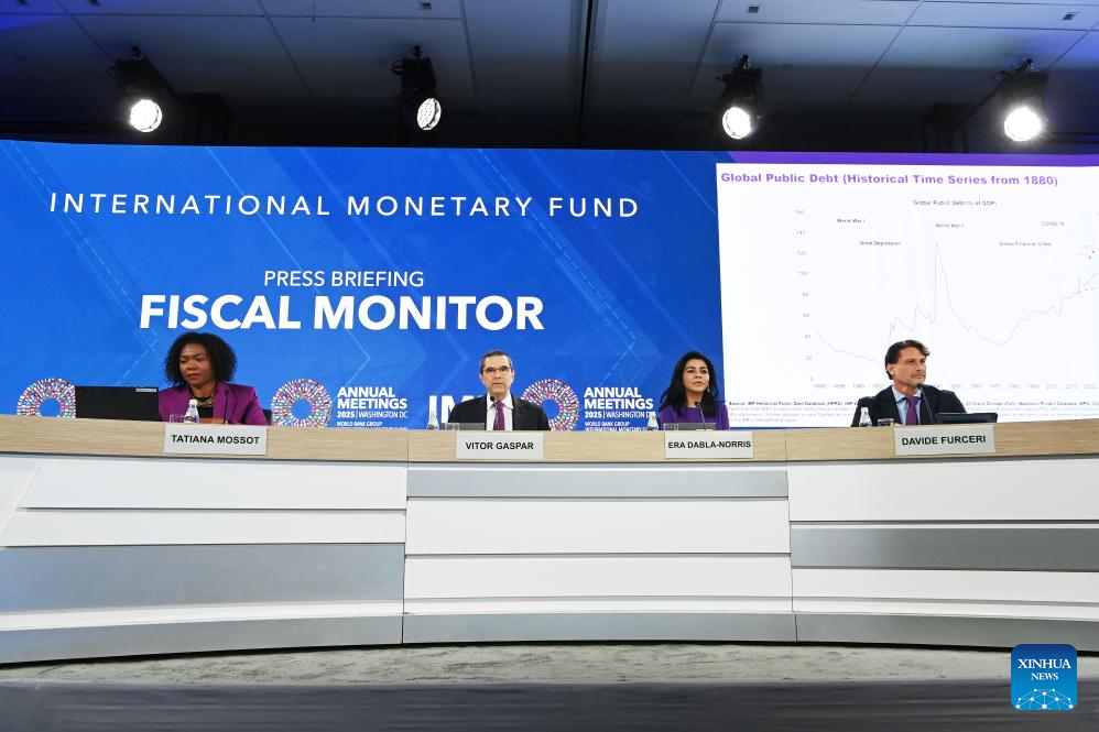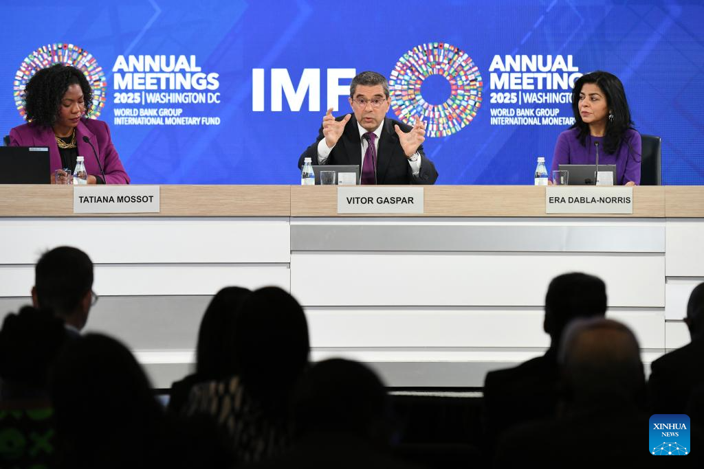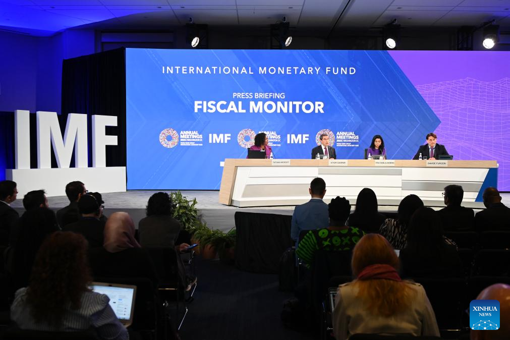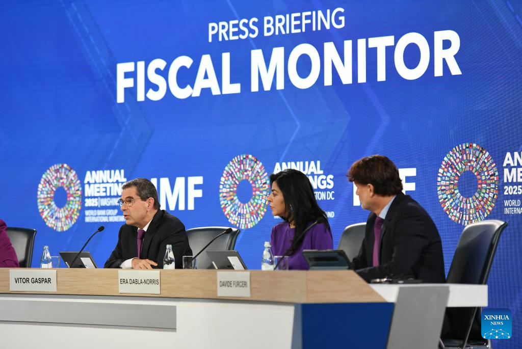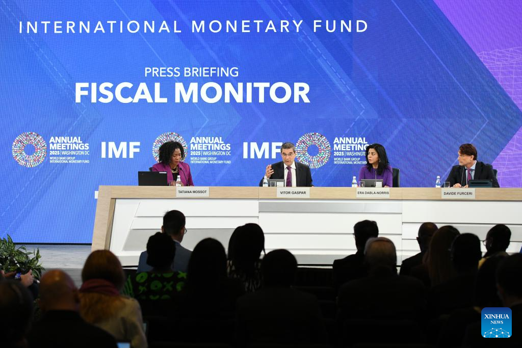This photo taken on Oct. 15, 2025 shows a press briefing on the IMF release of Fiscal Monitor in Washington, D.C., the United States. In the latest Fiscal Monitor released Wednesday, the IMF argued that enhancing spending efficiency can magnify gains "substantially," and alleviate the fiscal policy trilemma. (Xinhua/Li Rui)