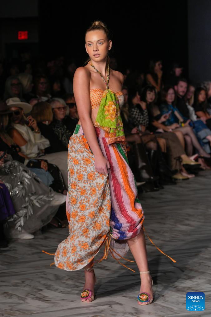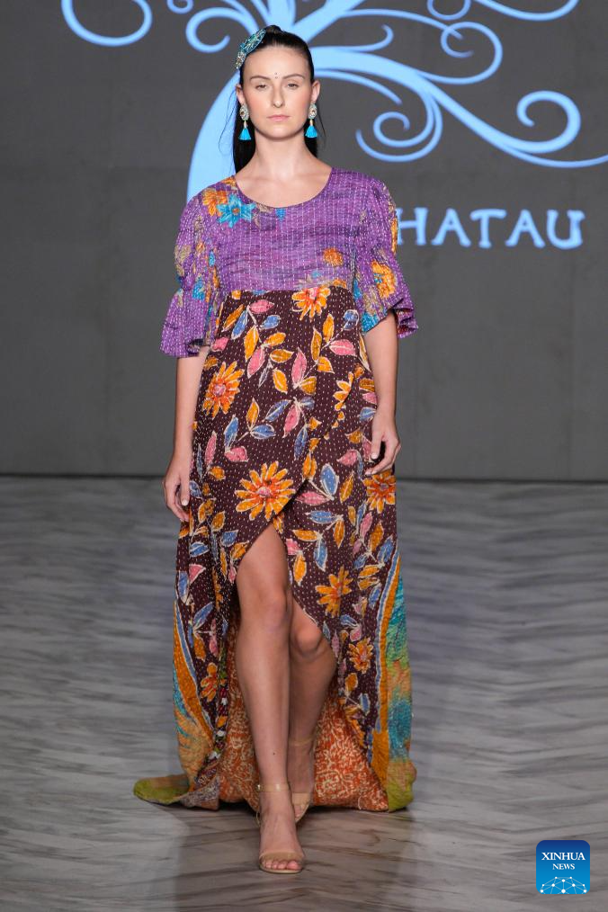 A model presents a creation of ANAHATAU during the Spring/Summer 2026 Collections Fashion Show at Vancouver Fashion Week in Vancouver, British Columbia, Canada, Oct. 15, 2025. (Photo by Liang Sen/Xinhua)