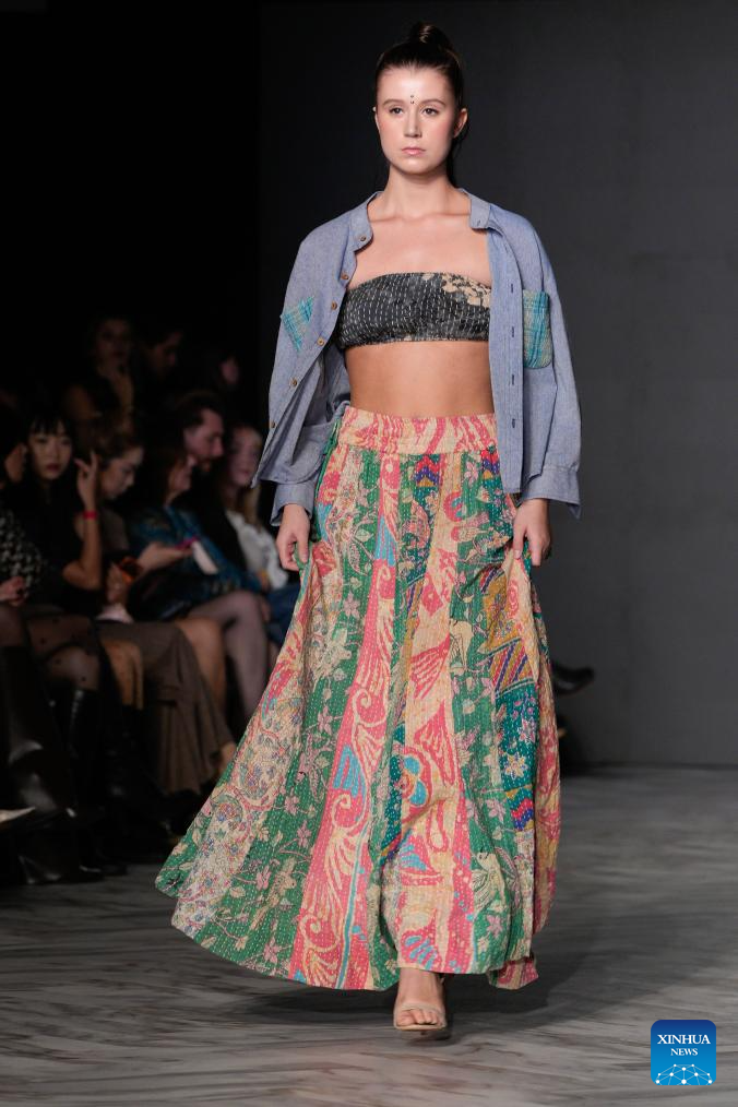 A model presents a creation of AMBUS during the Spring/Summer 2026 Collections Fashion Show at Vancouver Fashion Week in Vancouver, British Columbia, Canada, Oct. 15, 2025. (Photo by Liang Sen/Xinhua)