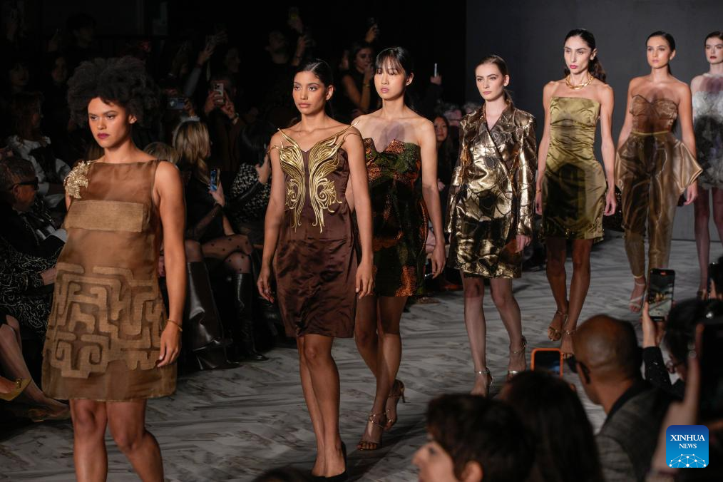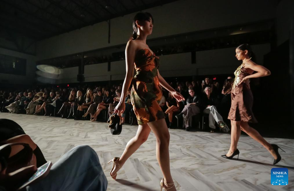 Models present creations of AMBUS during the Spring/Summer 2026 Collections Fashion Show at Vancouver Fashion Week in Vancouver, British Columbia, Canada, Oct. 15, 2025. (Photo by Liang Sen/Xinhua)