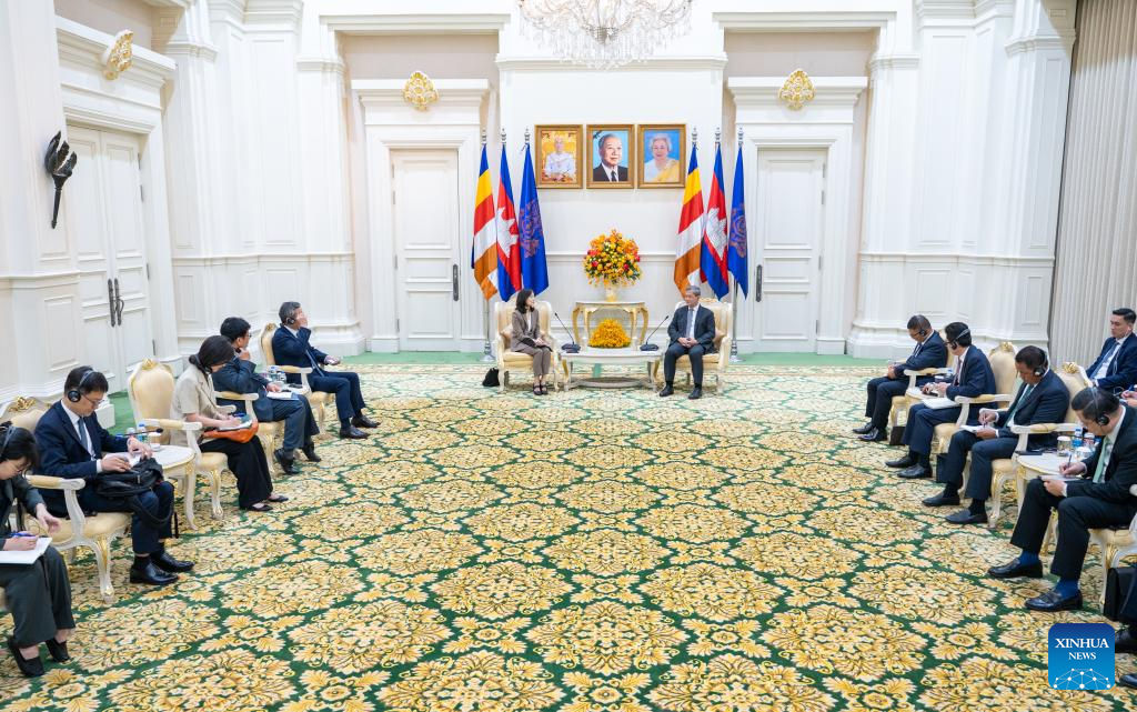 PHNOM PENH, Oct. 16 (Xinhua) -- Cambodian Prime Minister Hun Manet said on Thursday that he met here with South Korea's second vice minister of foreign affairs Kim Jina, discussing joint efforts to combat online scams.