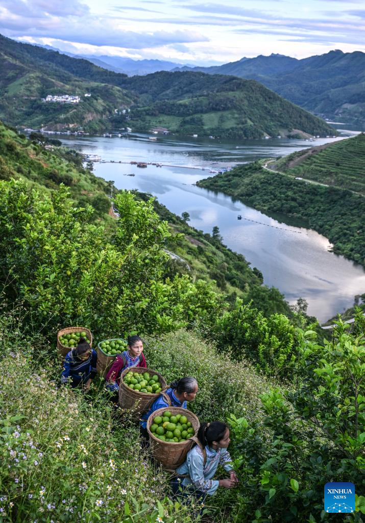 Villagers carry baskets filled with lemons in Zhexiang Town, Wangmo County, Bouyei-Miao Autonomous Prefecture of Qianxinan, southwest China's Guizhou Province, Oct. 15, 2025. Zhexiang Town in Wangmo County has cultivated green lemons across 4,600 mu (about 307 hectares), which has increased local farmers' incomes.