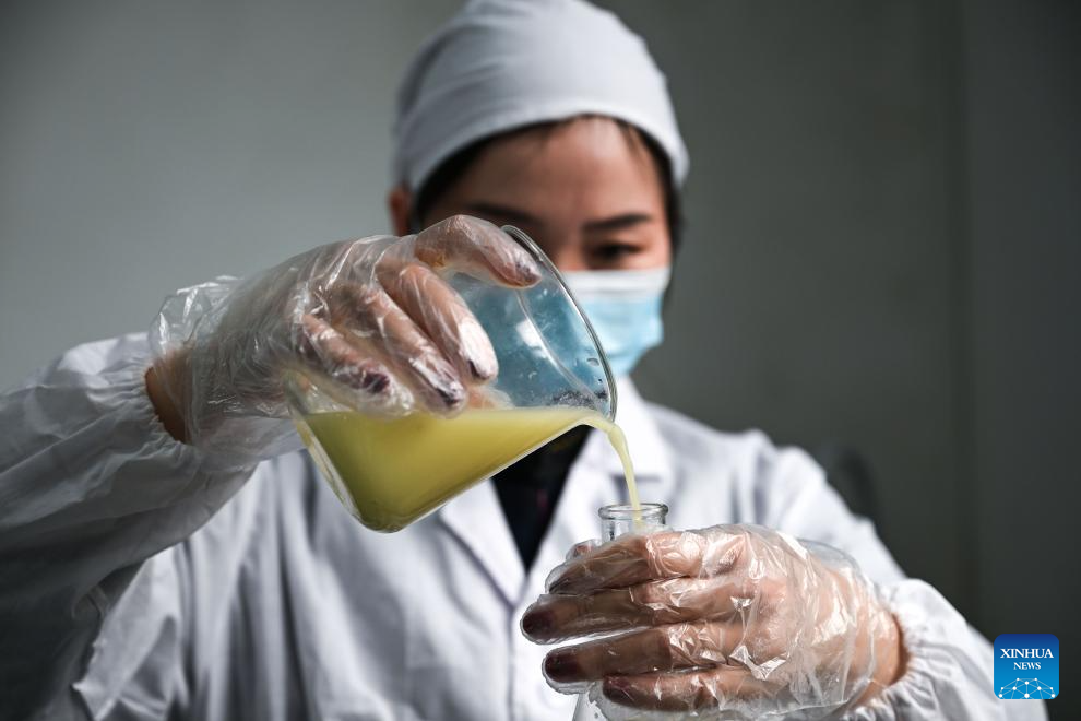 A staff member tests lemon juice at a lemon industrial park in Zhexiang Town, Wangmo County, Bouyei-Miao Autonomous Prefecture of Qianxinan, southwest China's Guizhou Province, Oct. 16, 2025. Zhexiang Town in Wangmo County has cultivated green lemons across 4,600 mu (about 307 hectares), which has increased local farmers' incomes.