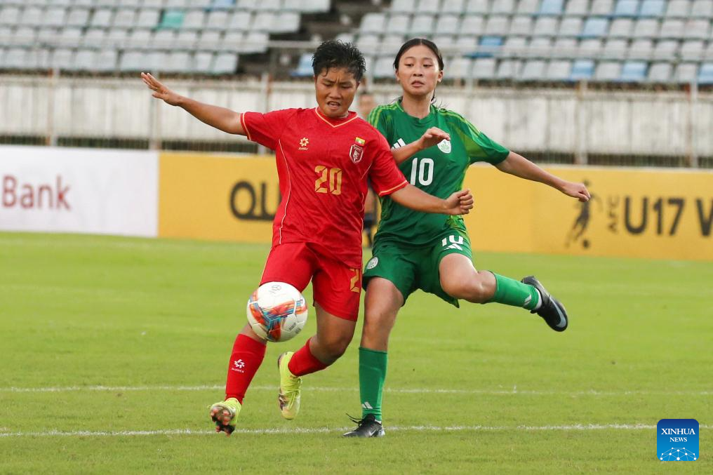 Min Htone May Zitar (Front) of Myanmar vies for the ball during the AFC U17 Women's Asian Cup China 2026 qualifier between Myanmar and China's Macao in Yangon, Myanmar, Oct. 15, 2025. (Xinhua/Myo Kyaw Soe)