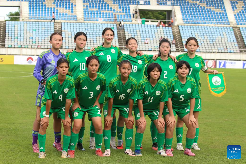 Starting players of China's Macao line up for photos before the AFC U17 Women's Asian Cup China 2026 qualifier between Myanmar and China's Macao in Yangon, Myanmar, Oct. 15, 2025. (Xinhua/Myo Kyaw Soe)