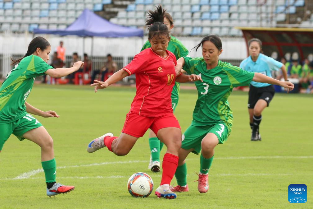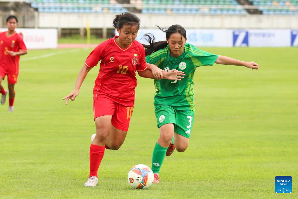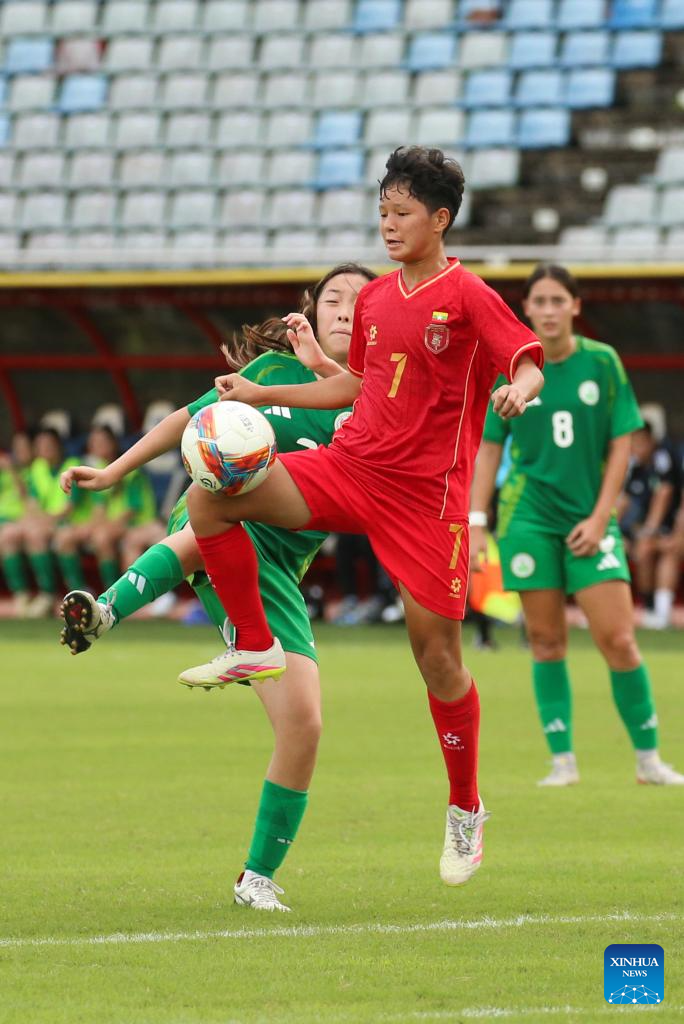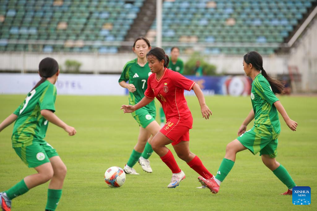 Shin Thant Phyu Sin Pyone (C) of Myanmar competes during the AFC U17 Women's Asian Cup China 2026 qualifier between Myanmar and China's Macao in Yangon, Myanmar, Oct. 15, 2025. (Xinhua/Myo Kyaw Soe)