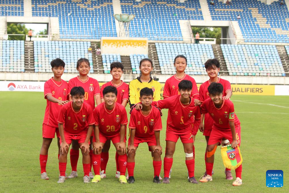 Starting players of Myanmar line up for photos before the AFC U17 Women's Asian Cup China 2026 qualifier between Myanmar and China's Macao in Yangon, Myanmar, Oct. 15, 2025. (Xinhua/Myo Kyaw Soe)