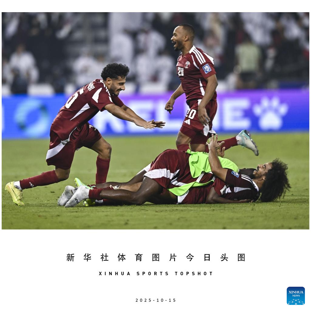 Players of Qatar celebrate after the FIFA World Cup 2026 AFC Asian Qualifiers group A playoffs match between Qatar and United Arab Emirates in Doha, Qatar, Oct. 14, 2025. (Photo by Nikku/Xinhua)