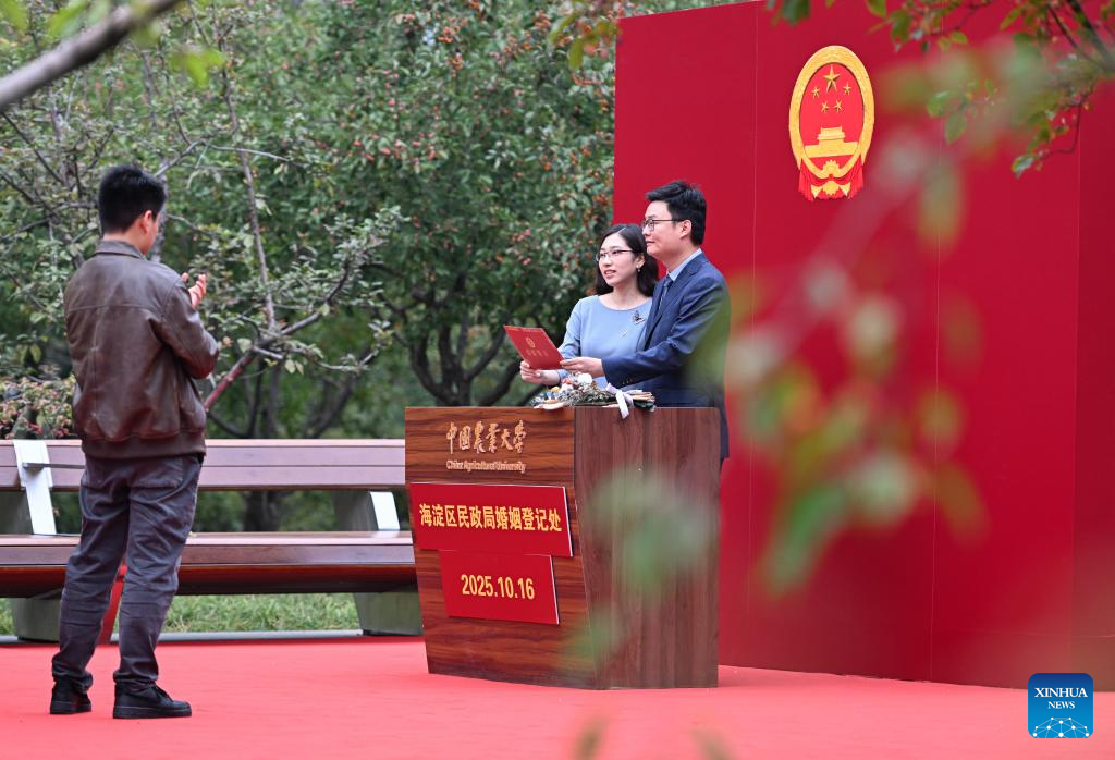 A couple pose for photos at a temporary marriage registration site at a campus of China Agricultural University in Beijing, capital of China, Oct. 16, 2025. The China Agricultural University on Thursday hosted a series of events to mark the 120th anniversary of its founding. (Xinhua/Chen Zhonghao)