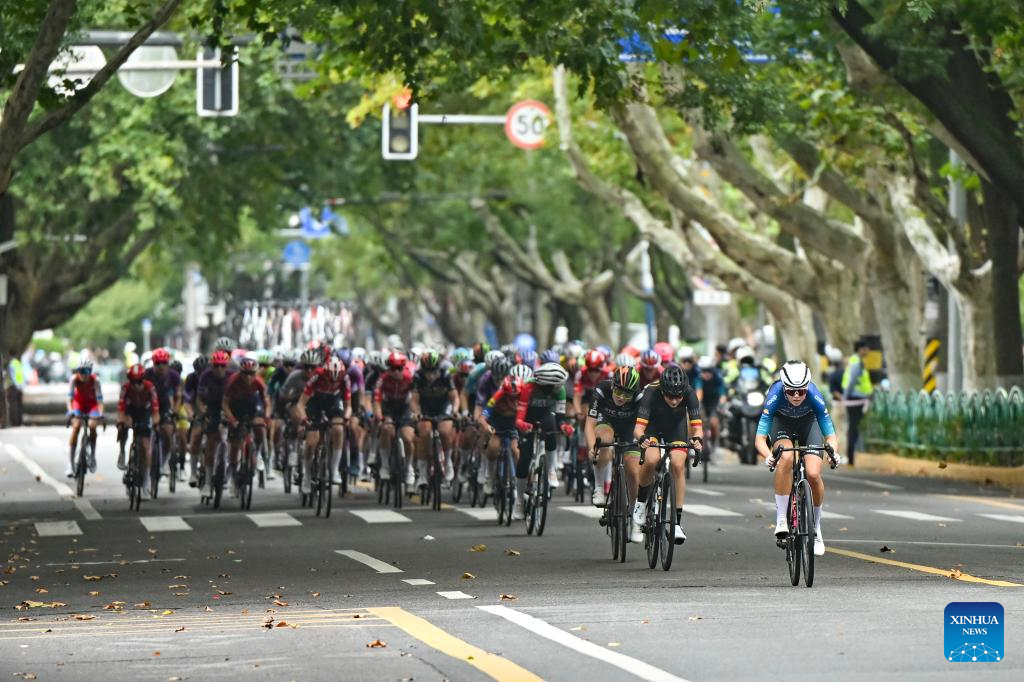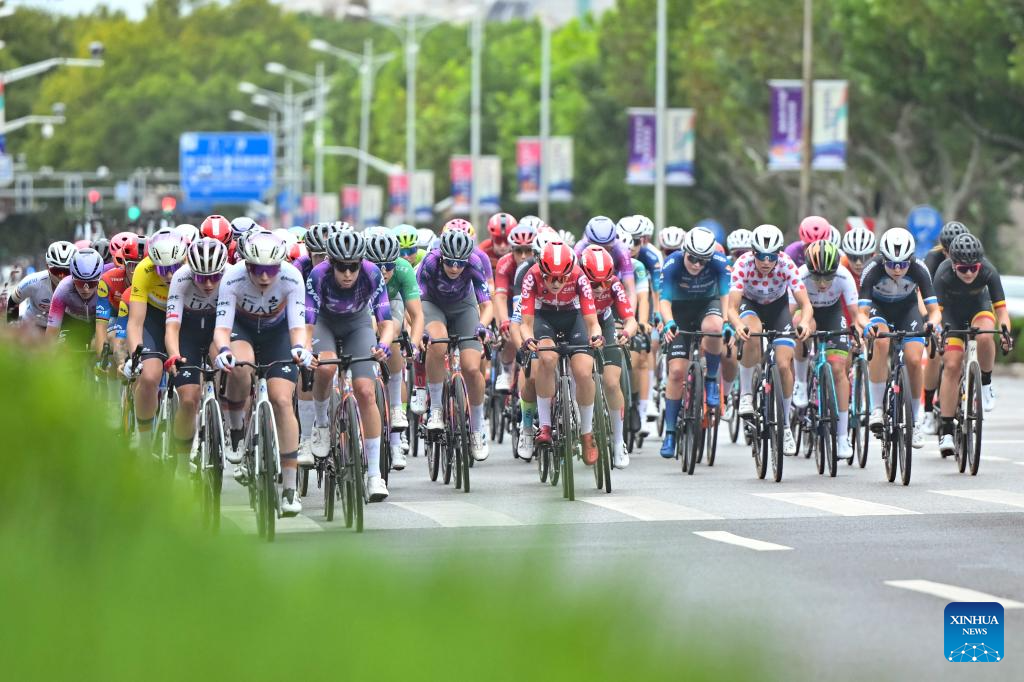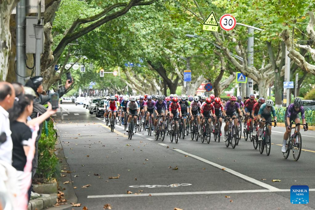 Cyclists compete during the Stage 3 of the UCI Women's WorldTour Tour of Chongming Island road cycling race in Shanghai, east China, Oct. 16, 2025. (Xinhua/Wang Xiang)