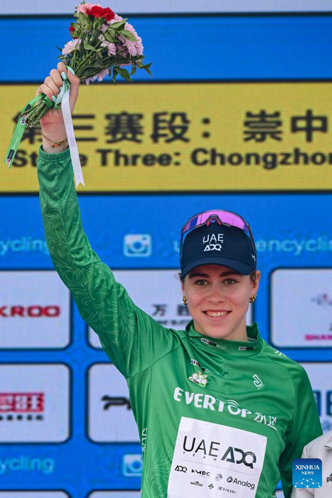 Sofie Van Rooijen of UAE Team ADQ, in the green jersey, is seen during the awarding ceremony after the Stage 3 of the UCI Women's WorldTour Tour of Chongming Island road cycling race in Shanghai, east China, Oct. 16, 2025. (Xinhua/Chen Haoming)