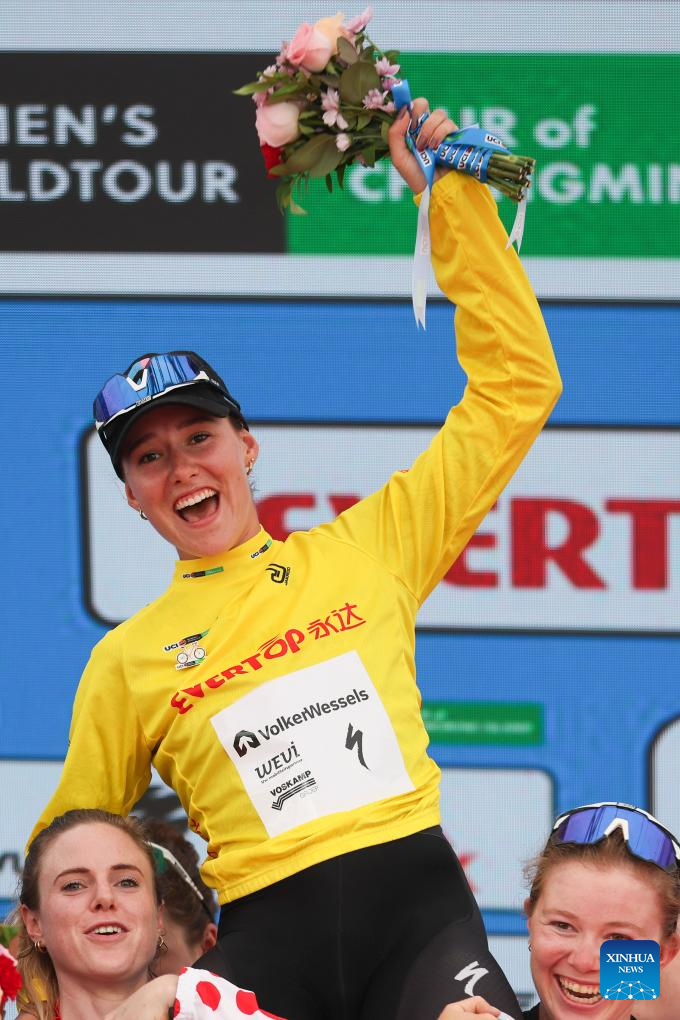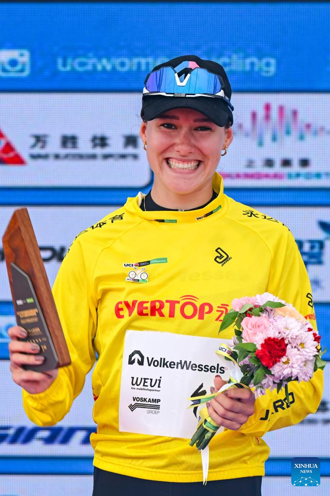 Anne Knijnenburg of Volkerwessels Cycling Team, in the yellow jersey, poses during the awarding ceremony after the Stage 3 of the UCI Women's WorldTour Tour of Chongming Island road cycling race in Shanghai, east China, Oct. 16, 2025. (Xinhua/Chen Haoming)