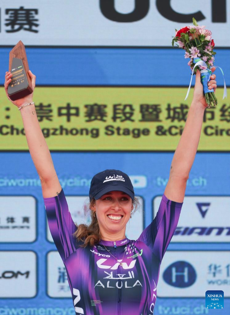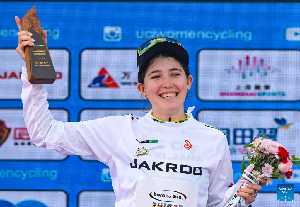 Josie Talbot of Liv-Alula-Jayco poses during the awarding ceremony after the Stage 3 of the UCI Women's WorldTour Tour of Chongming Island road cycling race in Shanghai, east China, Oct. 16, 2025. (Xinhua/Wang Xiang)