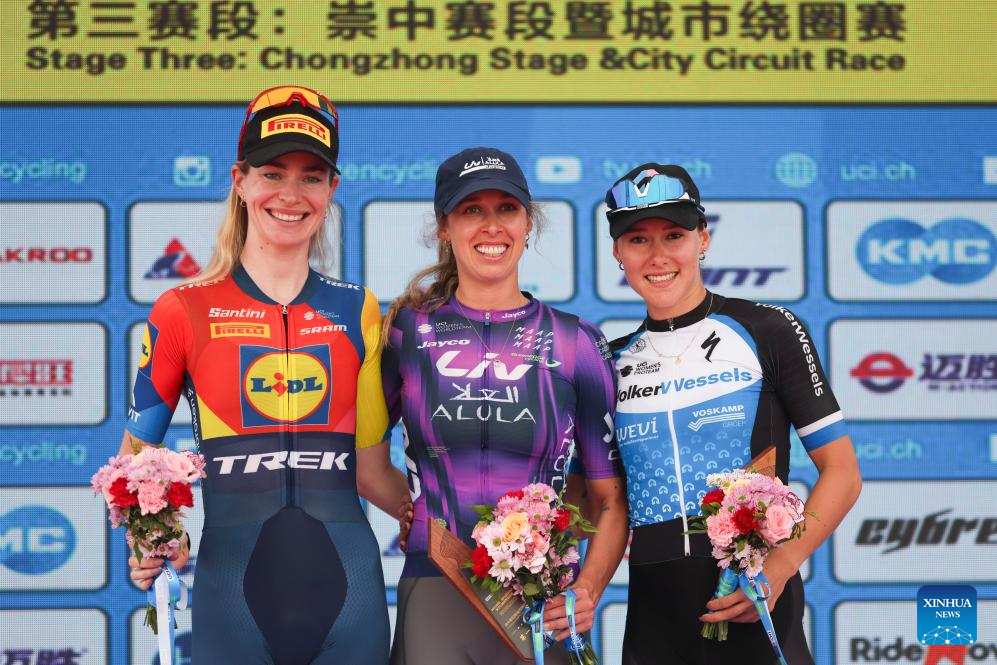 Josie Talbot (C) of Liv-Alula-Jayco, Riejanne Markus (L) of Lidl-Trek and Anne Knijnenburg of Volkerwessels Cycling Team pose during the awarding ceremony after the Stage 3 of the UCI Women's WorldTour Tour of Chongming Island road cycling race in Shanghai, east China, Oct. 16, 2025. (Xinhua/Wang Xiang)