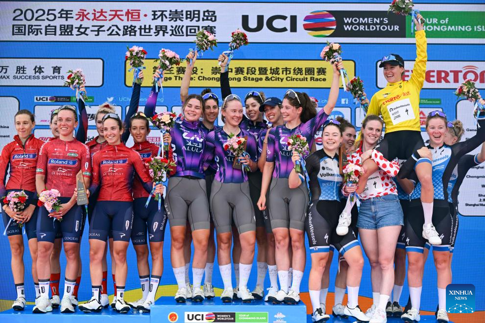 Cyclists of Liv-Alula-Jayco (C), cyclists of Roland Le Devoluy (L) and cyclists of Volkerwessels Cycling Team pose during the awarding ceremony after the Stage 3 of the UCI Women's WorldTour Tour of Chongming Island road cycling race in Shanghai, east China, Oct. 16, 2025. (Xinhua/Chen Haoming)