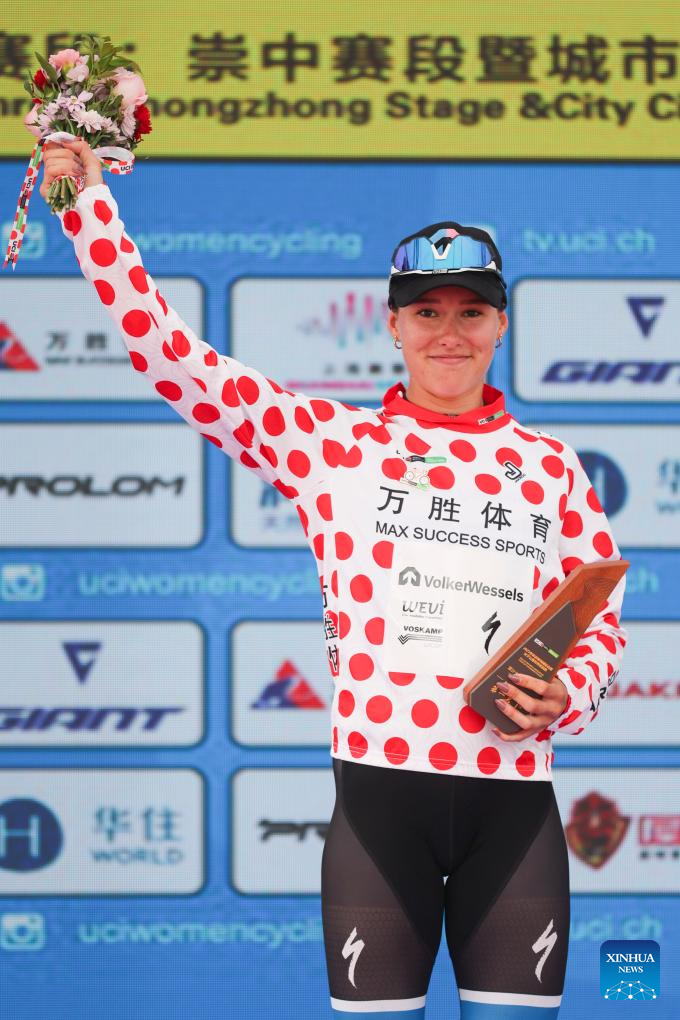 Anne Knijnenburg of Volkerwessels Cycling Team, in the polka-dot jersey, is seen during the awarding ceremony after the Stage 3 of the UCI Women's WorldTour Tour of Chongming Island road cycling race in Shanghai, east China, Oct. 16, 2025. (Xinhua/Wang Xiang)