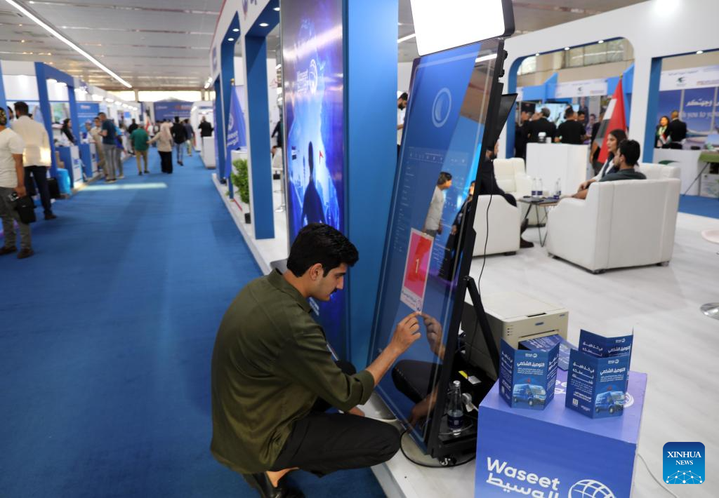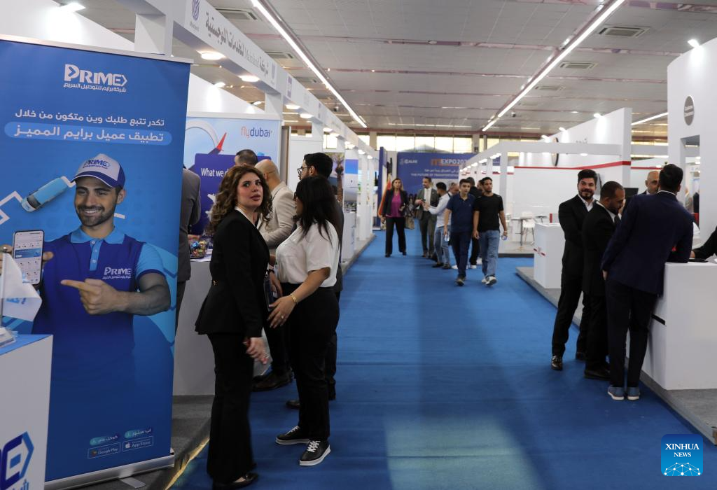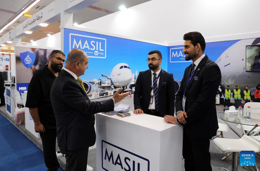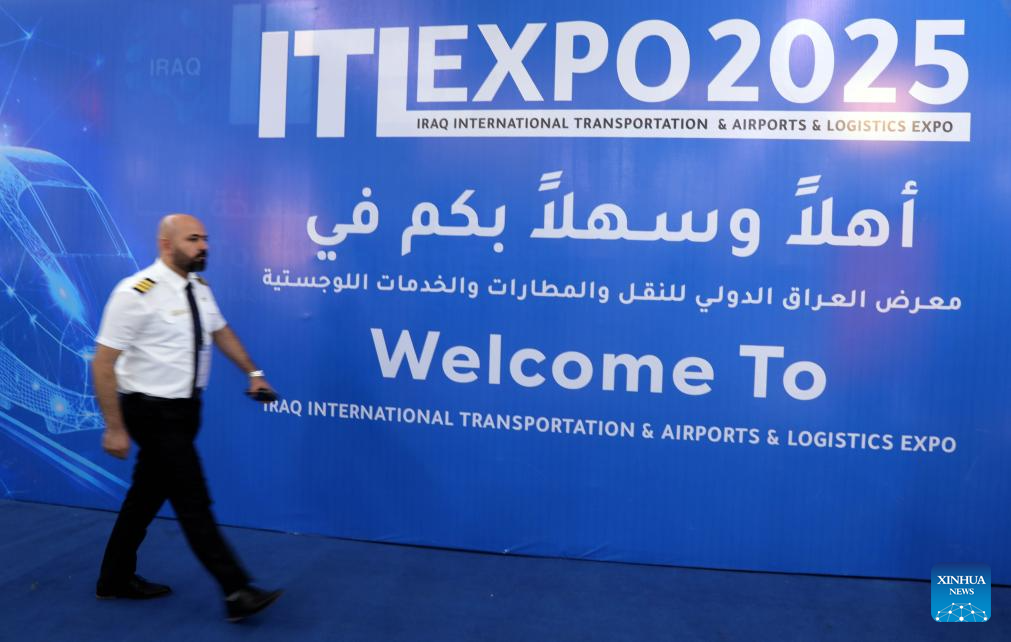 People visit the Iraq International Transportation, Airports, and Logistics Expo, in Baghdad, Iraq, Oct. 16, 2025. The Iraq International Transportation, Airports, and Logistics Expo is held in Iraq's capital Baghdad from Oct. 15 to 18. (Xinhua/Khalil Dawood)