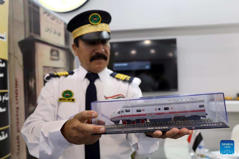 A man displays a train miniature during the Iraq International Transportation, Airports, and Logistics Expo, in Baghdad, Iraq, Oct. 16, 2025. The Iraq International Transportation, Airports, and Logistics Expo is held in Iraq's capital Baghdad from Oct. 15 to 18. (Xinhua/Khalil Dawood)