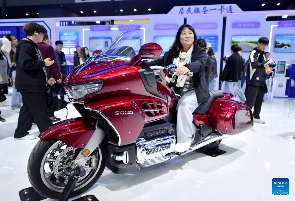 A visitor sits on a motorbike during the China International Digital Economy Expo 2025 in Shijiazhuang, north China's Hebei Province, Oct. 17, 2025. The Expo kicked off here on Friday and will last until Oct. 19. (Xinhua/Wang Xiao)