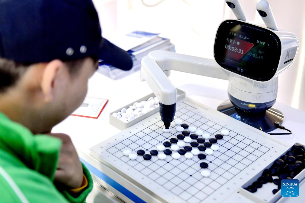 A visitor plays gobang with a robot during the China International Digital Economy Expo 2025 in Shijiazhuang, north China's Hebei Province, Oct. 17, 2025. The Expo kicked off here on Friday and will last until Oct. 19. (Xinhua/Wang Xiao)