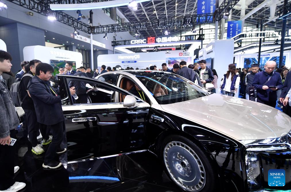 Visitors learn about an intelligent vehicle during the China International Digital Economy Expo 2025 in Shijiazhuang, north China's Hebei Province, Oct. 17, 2025. The Expo kicked off here on Friday and will last until Oct. 19. (Xinhua/Wang Xiao)