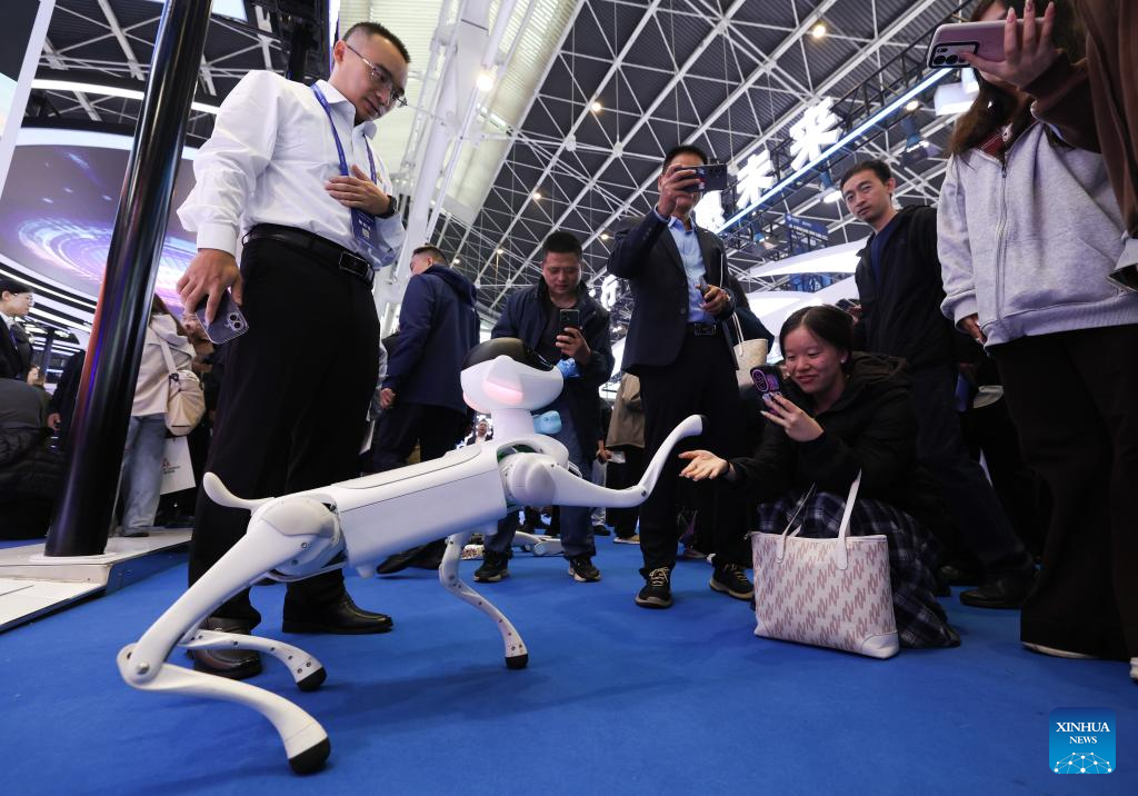 Visitors interact with a robot dog during the China International Digital Economy Expo 2025 in Shijiazhuang, north China's Hebei Province, Oct. 17, 2025. The Expo kicked off here on Friday and will last until Oct. 19. (Photo by Liang Zidong/Xinhua)