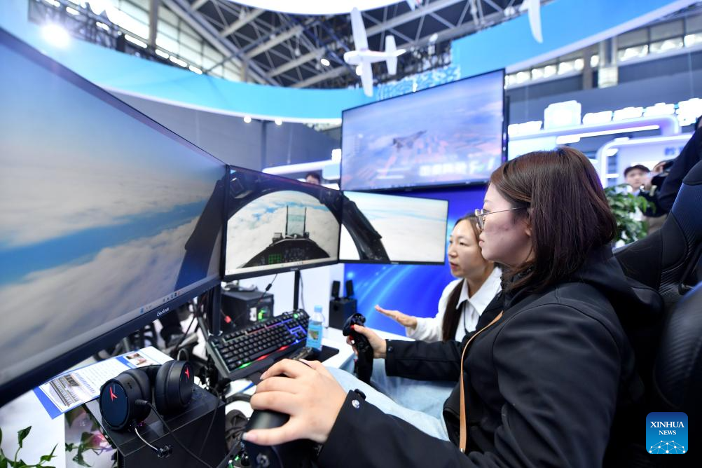 A visitor tries a simulated flight during the China International Digital Economy Expo 2025 in Shijiazhuang, north China's Hebei Province, Oct. 17, 2025. The Expo kicked off here on Friday and will last until Oct. 19. (Xinhua/Wang Xiao)