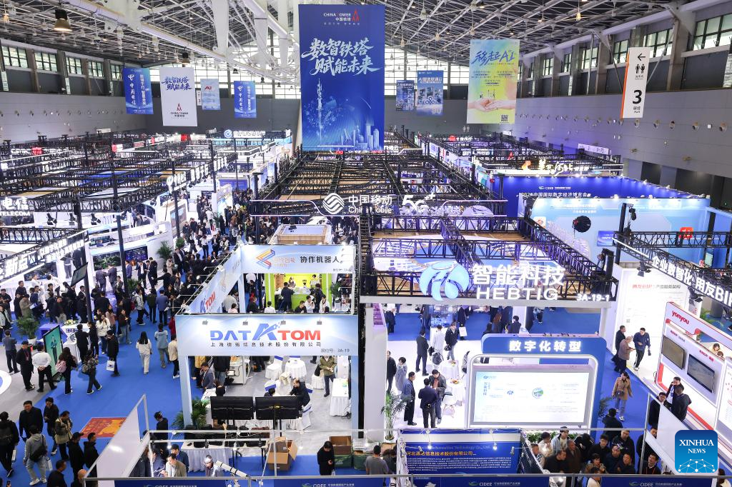 This photo taken on Oct 17, 2025 shows the China International Digital Economy Expo 2025 in Shijiazhuang, north China's Hebei Province. The Expo kicked off here on Friday and will last until Oct. 19. (Photo by Liang Zidong/Xinhua)