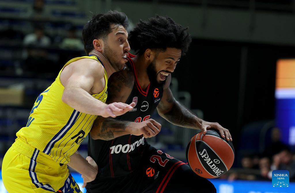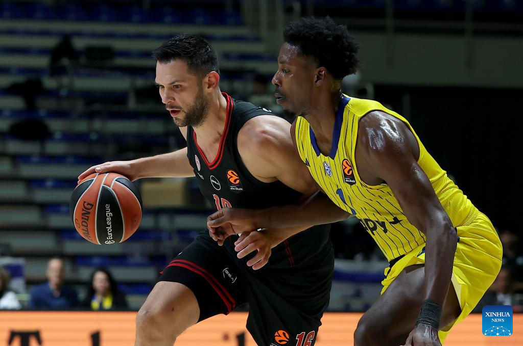 Tyler Dorsey (R) of Olympiacos vies with Maccabi's Tamir Blatt during the regular season round 5 Euroleague basketball match between Maccabi Tel-Aviv and Olympiacos in Belgrade, Serbia, Oct. 16, 2025. (Photo by Predrag Milosavljevic/Xinhua)