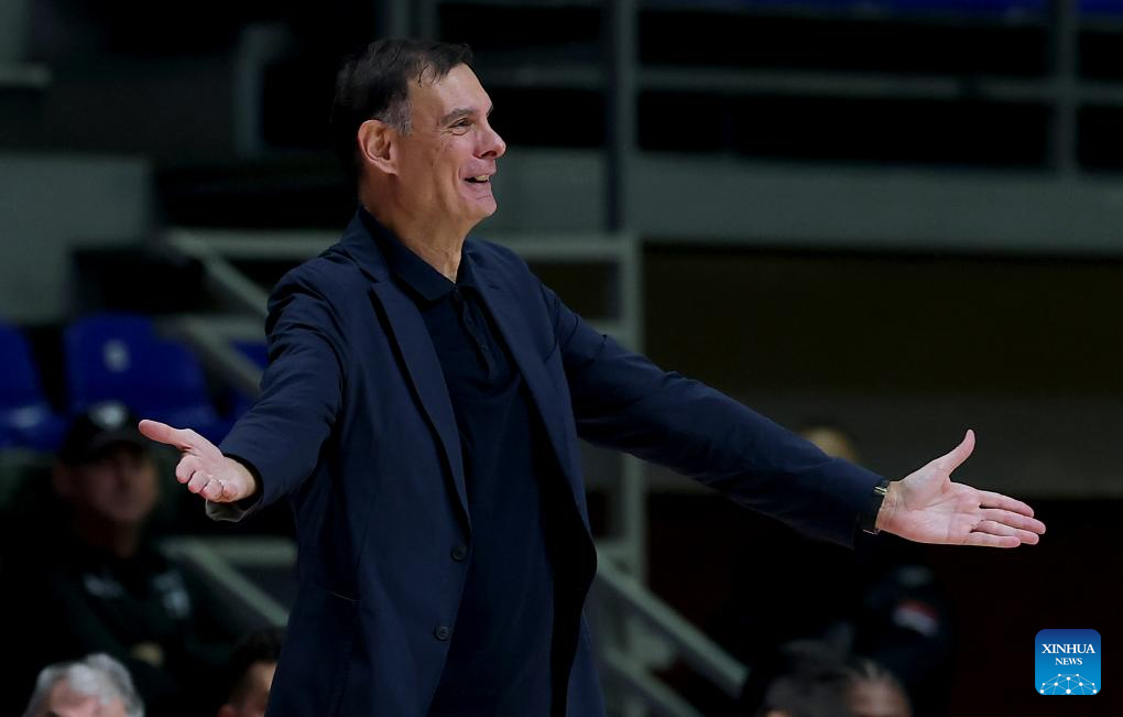 Head coach of Olympiacos Georgios Bartzokas gestures during the regular season round 5 Euroleague basketball match between Maccabi Tel-Aviv and Olympiacos in Belgrade, Serbia, Oct. 16, 2025. (Photo by Predrag Milosavljevic/Xinhua)