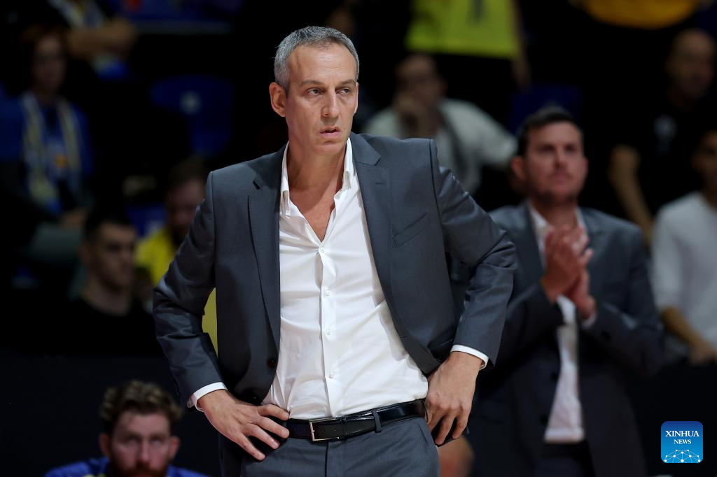 Maccabi's head coach Oded Kattash reacts during the regular season round 5 Euroleague basketball match between Maccabi Tel-Aviv and Olympiacos in Belgrade, Serbia, Oct. 16, 2025. (Photo by Predrag Milosavljevic/Xinhua)