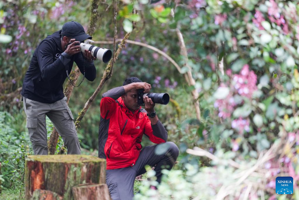 Photographers take pictures of flowers at Horton Plains National Park in Nuwara Eliya, Sri Lanka, on Oct. 15, 2025. Horton Plains National Park, located in the central highlands of Sri Lanka at an elevation of over 2,000 meters, is one of the island's highest plateau ecosystems and the source of several major rivers.