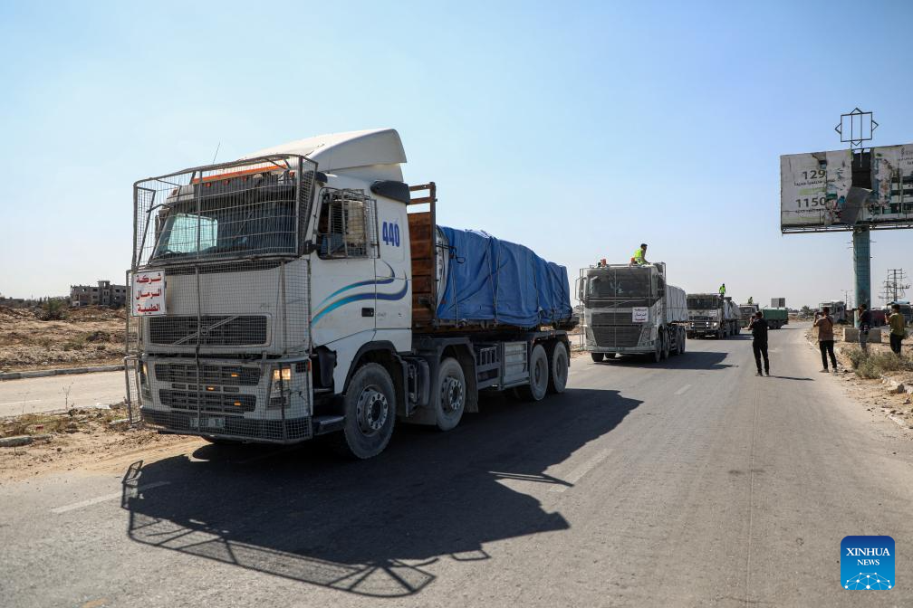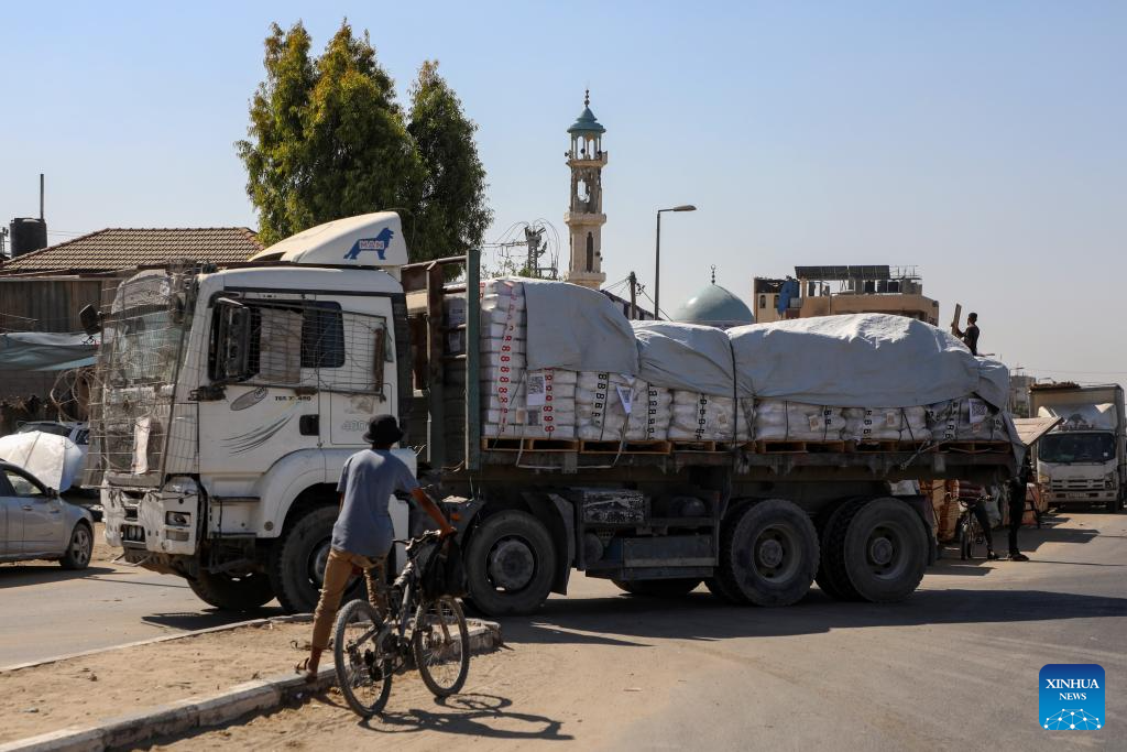 Trucks carrying aid supplies are seen in Deir al-Balah, central Gaza Strip, on Oct. 16, 2025. A whole convoy of aid trucks from the World Food Programme has managed to get to a warehouse in Gaza without being looted, and there has been a dramatic drop in looting incidents, a UN spokesperson said Thursday. (Photo by Rizek Abdeljawad/Xinhua)