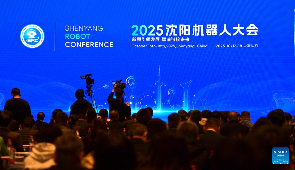 This photo taken on Oct. 17, 2025 shows the opening ceremony of the Shenyang Robot Conference 2025 in Shenyang, northeast China's Liaoning Province. The two-day event kicked off here on Friday. (Xinhua/Wu Qinghao)