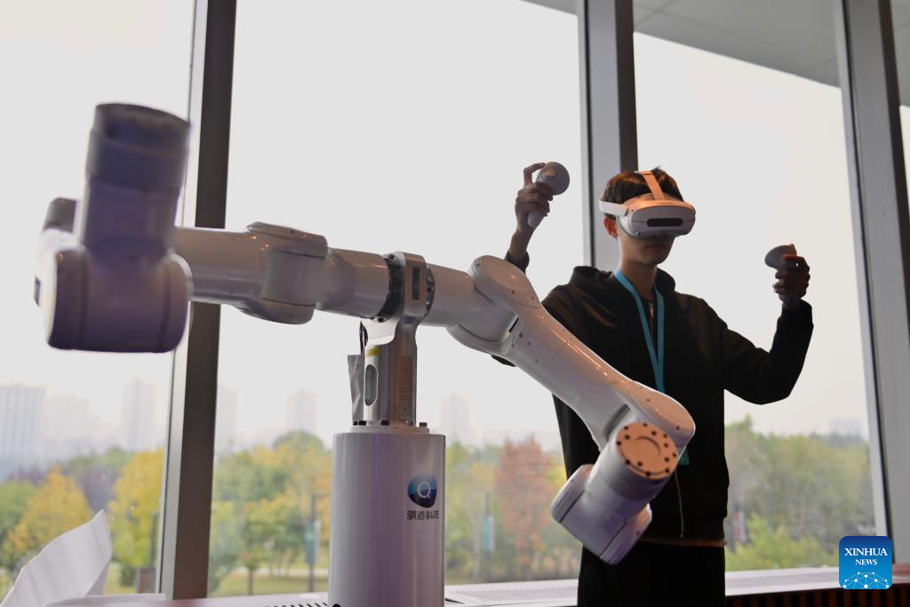 A staff member demonstrates a humanoid arm at the Shenyang Robot Conference 2025 in Shenyang, northeast China's Liaoning Province, Oct. 17, 2025. The two-day event kicked off here on Friday. (Xinhua/Wu Qinghao)