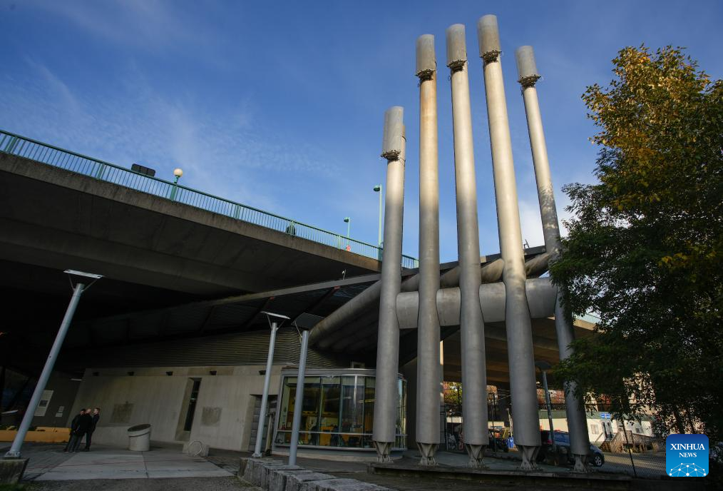 Boiler stacks are seen outside the False Creek Neighborhood Energy Utility (NEU) facility in Vancouver, British Columbia, Canada, Oct. 16, 2025. The city of Vancouver announced Thursday that the False Creek NEU has completed a major expansion of its sewage heat recovery system, which supplies low-carbon heating to 47 buildings and benefits more than 10,000 residents. (Photo by Liang Sen/Xinhua)