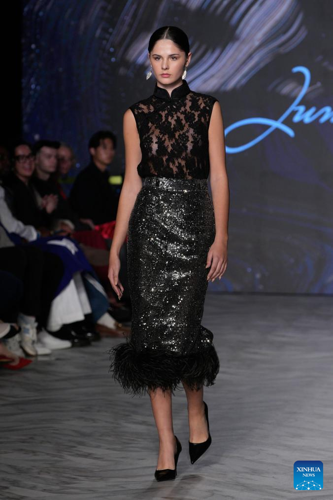 Models walk the runway in JUMPER ZHANG's Spring/Summer 2026 collection during Vancouver Fashion Week in Vancouver, British Columbia, Canada, Oct. 16, 2025. (Photo by Liang Sen/Xinhua)