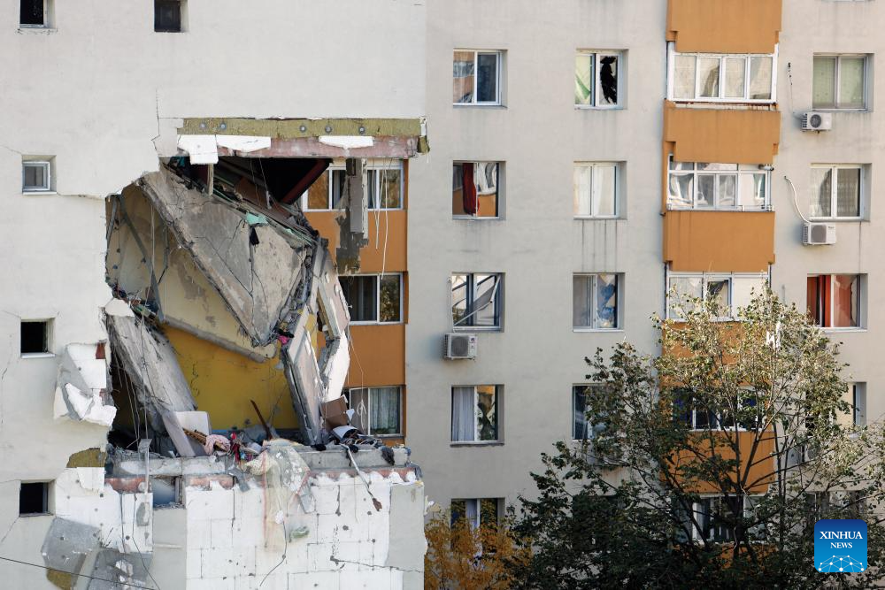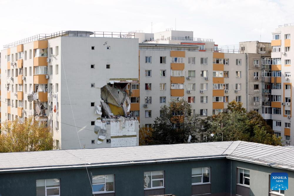 A residential building hit by an explosion is pictured in Bucharest, Romania, Oct. 17, 2025. Three people were killed and at least 13 others injured after an explosion ripped through an apartment block in the Romanian capital here on Friday, authorities said. (Photo by Cristian Cristel/Xinhua)
