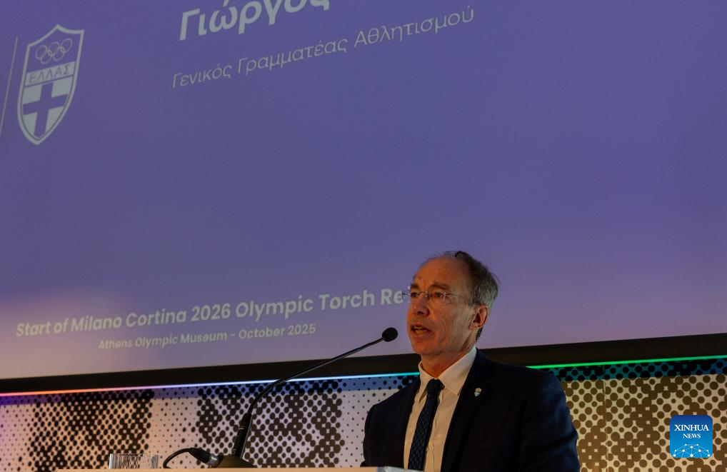 Isidoros Kouvelos, president of the Hellenic Olympic Committee, speaks during a press conference on the preparations for the Olympic flame lighting and handover ceremonies, in Athens, Greece, Oct. 16, 2025. Greek water polo athlete Eleni Xenaki will be the last torchbearer on Greek soil for the 2026 Milano-Cortina winter Olympic Games, the Hellenic Olympic Committee (HOC) said during the press conference held in Athens on Thursday. Greek alpine skier Alexandros Ginnis will start the torch relay at the end of the Olympic flame lighting ceremony which will be held on Nov. 26 at ancient Olympia, in western Greece, the birthplace of the Olympic Games. (Photo by Marios Lolos/Xinhua)
